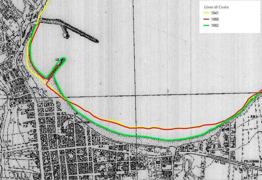 Figura 23 – Carta Tecnica Regionale del 1992 nel quale sono mostrate le linee di riva del 1941, 1968 e 1992.